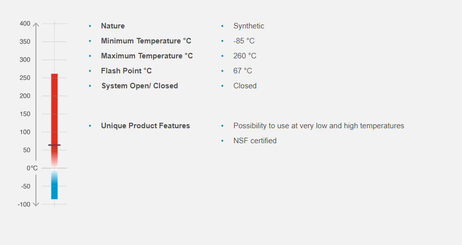 • Offers a very high resistance to oxidation, contributing to the fluid’s longevity and reducing the frequency of replacement.